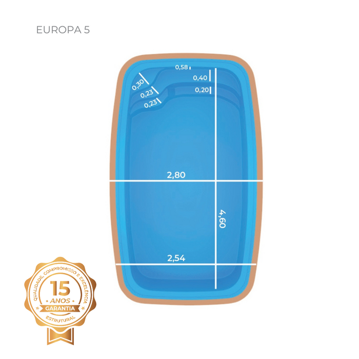 Apresentamos a Piscina Europa 5: Com dimensões de 5,00m x 2,80m e uma profundidade de 1,30m, oferece um espaço espaçoso e convidativo para momentos de lazer e diversão aquática. Sua borda de 0,20m adiciona um toque de elegância ao design, enquanto sua capacidade de 14.000 litros proporciona uma experiência aquática envolvente para toda a família.
